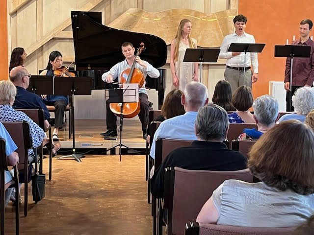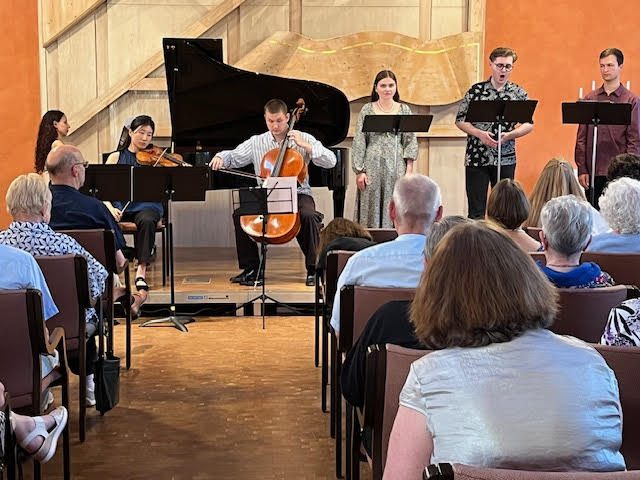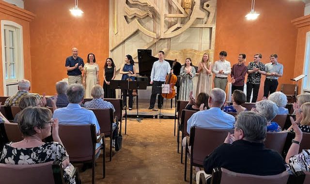 Zu Beginn des Programms wurden schottische Folksongs in Bearbeitungen für Gesangsstimmen op. 108 präsentiert, begleitet und umrahmt von Violine, Cello und Klavier, gespielt von Instrumentalisten aus der Kammermusikklasse von Frau Prof. Tatevik Mokatsian (HfM Saar). Das Musizieren bereitete den jungen Künstlerinnen und Künstlern sichtlich Freude, was sich auch unmittelbar auf das Publikum übertrug. Ein erfreulicher Nebeneffekt dieses gemeinsamen Konzertes der beiden Hochschulklassen besteht darin, dass sie außerhalb ihres üblichen Repertoires erfolgreich zusammenarbeiten und dabei wertvolle neue musikalische Erfahrungen sammeln.