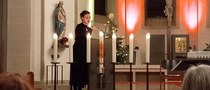 Den größten Raum nahmen die siebenteiligen „O-Antiphonen des Advent“ von Marc-Antoine Charpentier (1643 – 1704) und das prächtige „Magnificat“, das seinem Zeitgenossen Dieterich Buxtehude (1637 – 1707) zugeschrieben wird. Ergänzt und verbunden wurden die musikalischen Elemente in einer eindrücklichen szenischen Inszenierung, mit wechselnden Aufstellungen der Musiker, mit kurzen Texten, teils liturgischer Art, und mit mehreren gemeinsam mit dem Publikum gesungenen adventlichen Liedern. Alles koordiniert und dirigiert von Lutz Gillmann an der eigens aufgestellten Blockorgel. So wurde eine wunderbare Verbindung zwischen den Musikern und den Zuhörern aufgebaut, die immer eine wesentliche Bedingung für das Erleben von Musik darstellt.